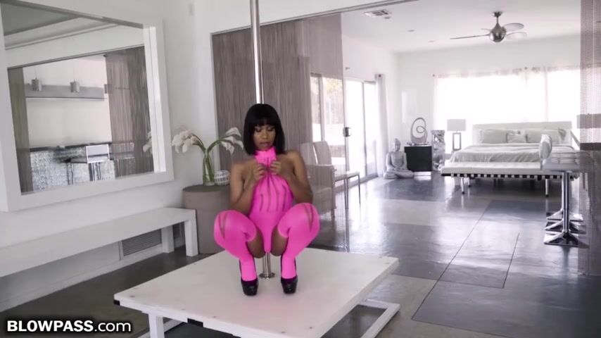 Jenna Foxx is an attractive black girl in a pink outfit, who poses voluptuously at a pole. She's ready to tease her partner Mick Blue and drive him crazy endlessly! Next, this beauty approaches him and starts giving him a close-up blowjob. She sucks Mick's big hard cock with all possible passion and gets a lot of pleasure from this hot process. It seems that this cutie loves to enjoy rough blowjobs and even is ready to lick her lover's asshole!